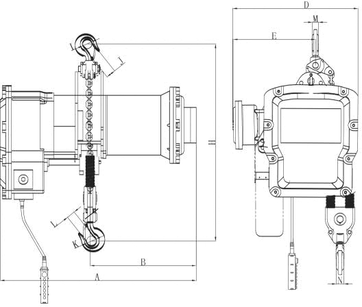 新設(shè)計(jì)的磁力產(chǎn)生器,其特性為產(chǎn)磁??稍陔娫辞袛嗟耐瑫r(shí)間剎車,保證吊重時(shí)剎車確保安全。極限開關(guān):吊上吊下都有極限開關(guān)裝置,使自動(dòng)停止,防止鏈條超出,確保安全..